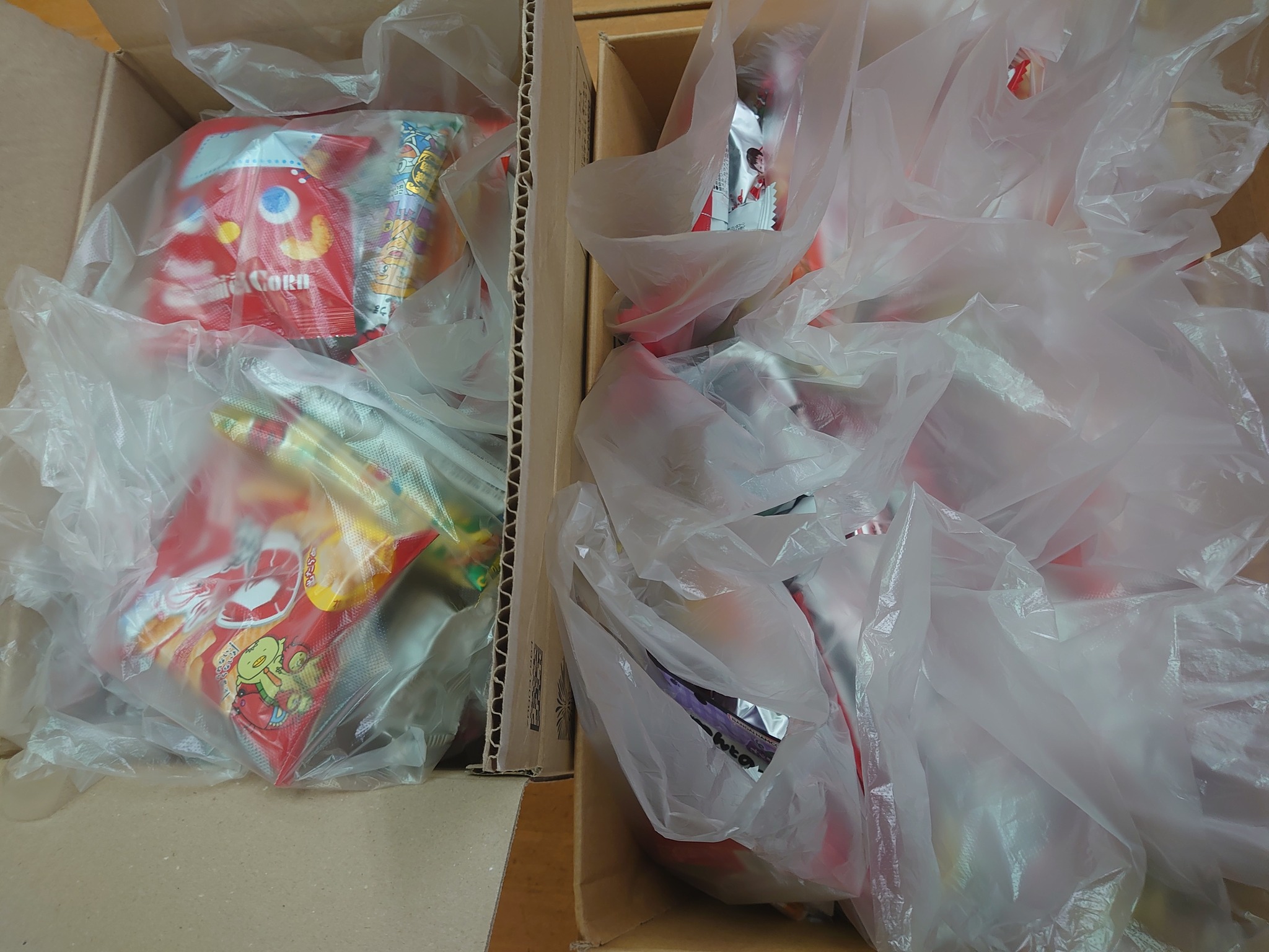 お菓子セット。袋によって少しお菓子の種類が違うので、👦子ども達👧が自分で楽しそうに選びます。ちゃんと中身の違いを説明してあげますよ。「こっちはポテチ」「こっちはキャラメルコーンが入ってるよ」などと(^O^)。