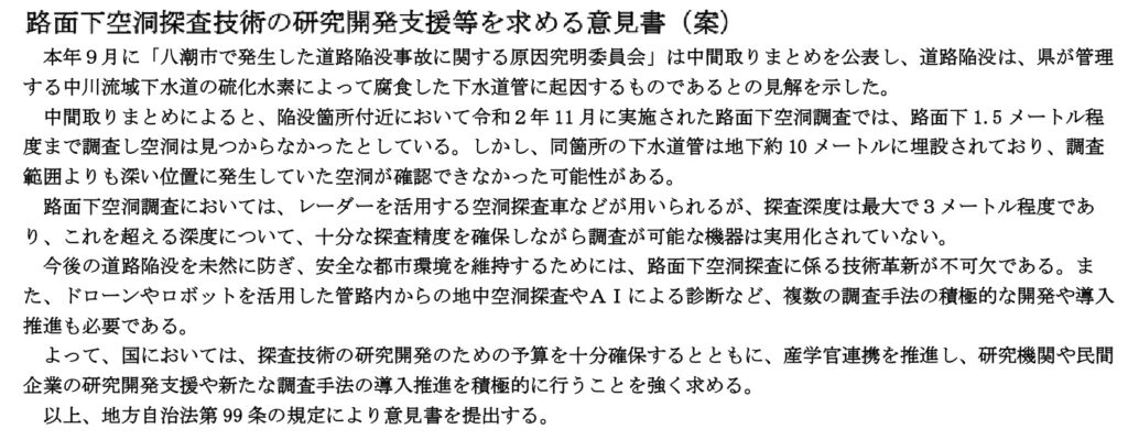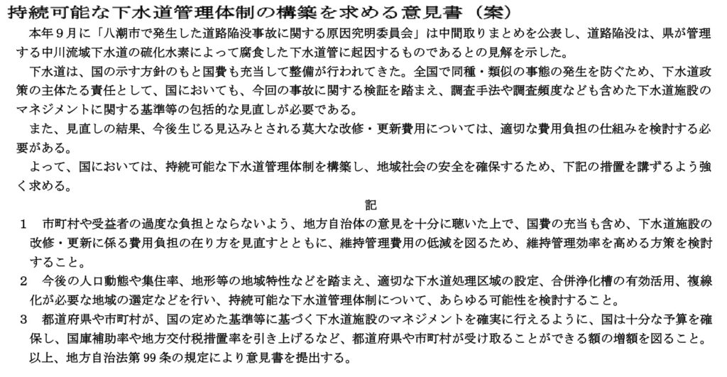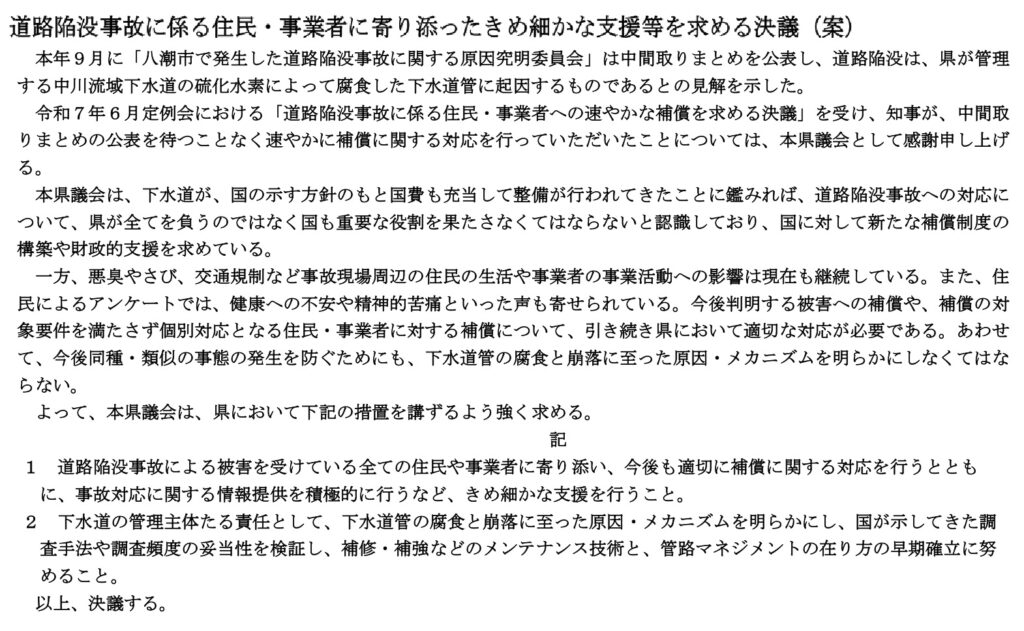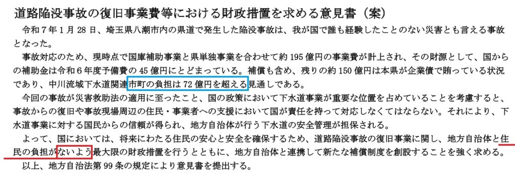 【八潮 下水管陥没】について先ほど県議会で可決された(担当委員会)内容で、他県の方にもご注目頂きたい部分は、「住民の負担が増えないよう」と求めた事です。