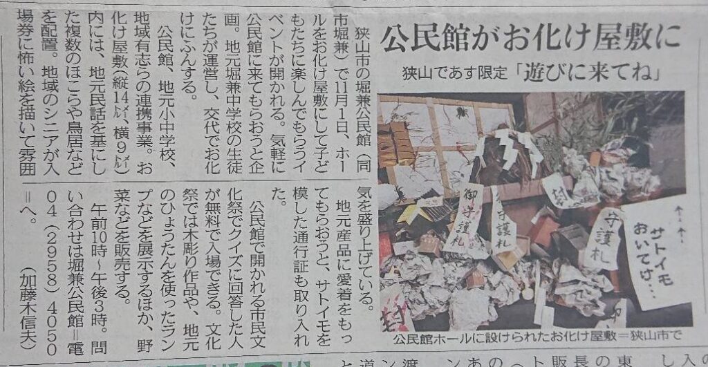 あす(土)1day限定公開❗ 10~3時 🏫学校の父母18人と生徒6人、👧幼稚園児👦も会場設営を手伝ったとの事。今朝(金)の新聞📷️にも掲載され、明日、お化け屋敷が混み合うかも!? 会場の作り込みがスゴい。storyも出来ていて、📷写真で2回の投稿に分けて、解説します。でも怖いのは😱お化けより、🐻クマかも。😱お化けの仕掛けの写真も撮りましたがネタバレ防止の為、その部分は明日終了後に公開しようかな。