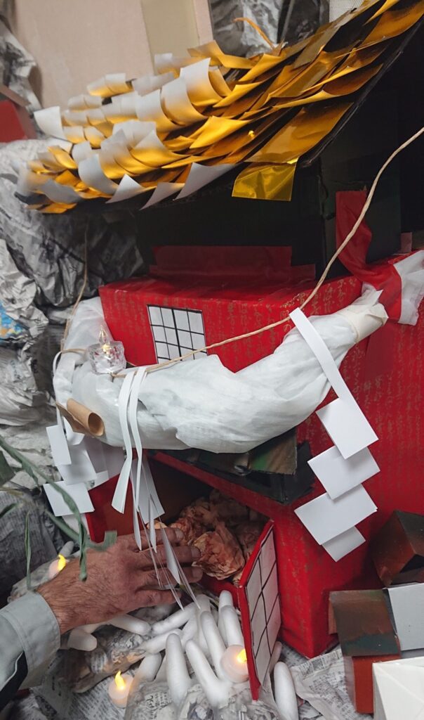 📷神社の中に、幼稚園児が紙で作った里芋が入っていて、祀られている。