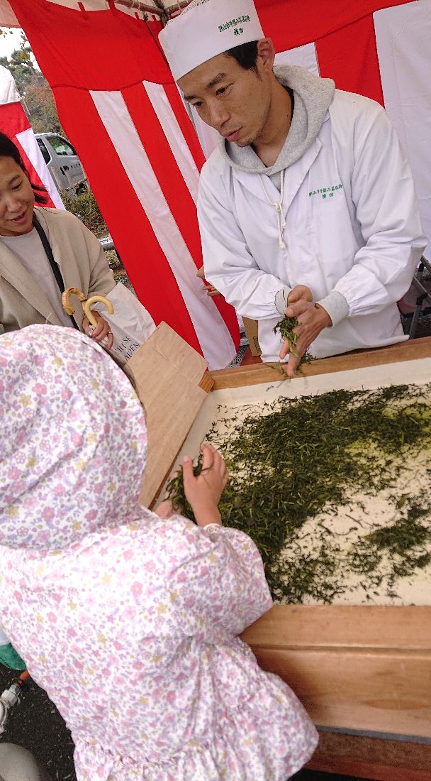 👧子ども達👦などに、お茶屋さんによる『手揉み茶』の実演体験。🍵お茶文化の伝承。若い横田園さんならではの📷目配りですね👍。(📷『さやま大茶会』にて)