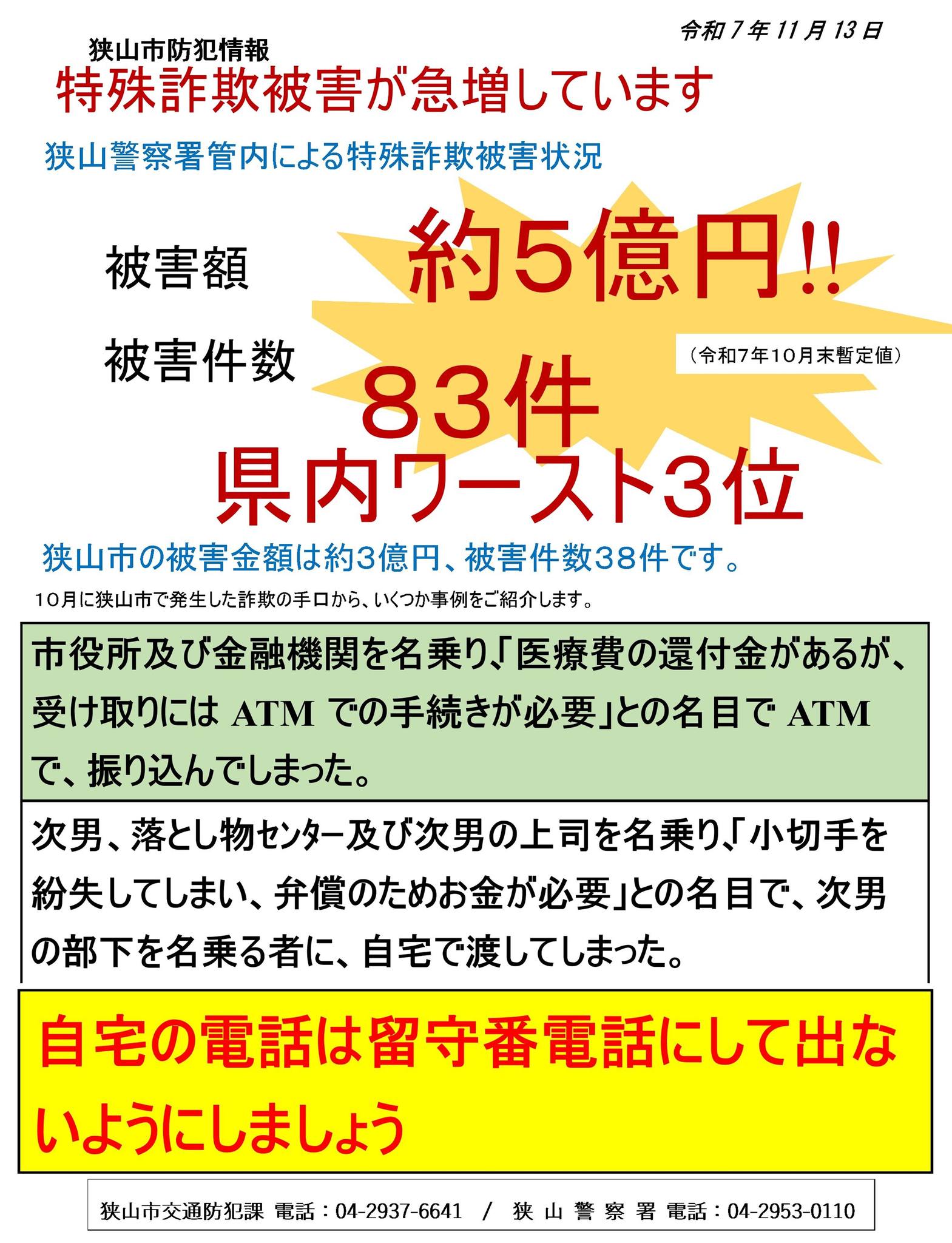 【詐欺被害 県内ワースト3 狭山警察署管内】