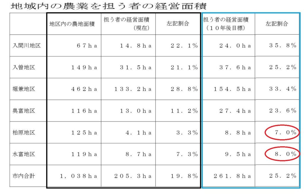 赤丸が分かりやすい。8年後、その地区の92%は農家さんが居ないので、農地が使う事が出来ない。