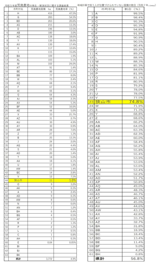 県庁が「狭山以外の市町村名を公開してくれるな」と言われるので、私がアルファベットにした。今日までに県庁の考えが変わる事をねがったが、残念。