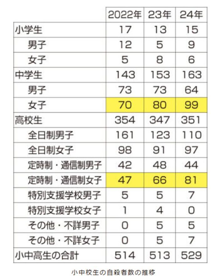 「おはようございます。埼玉県の発表は28名ですが、小中高、それぞれの内訳が公開されていません。2024年の児童生徒の自殺件数は529名ですが、小学生17人、中学生161人、高校生351人(さらに高校生は男子166人・女子185人、中学生、男子64人・女子99人、小学生男子9人・女子が6人)と内訳も明らかになっています。別添の資料は福祉新聞からです。ぜひ、児童生徒の自殺防止対策のためにも、県議会でも詳細を明らかにしていただきたいと思います。」