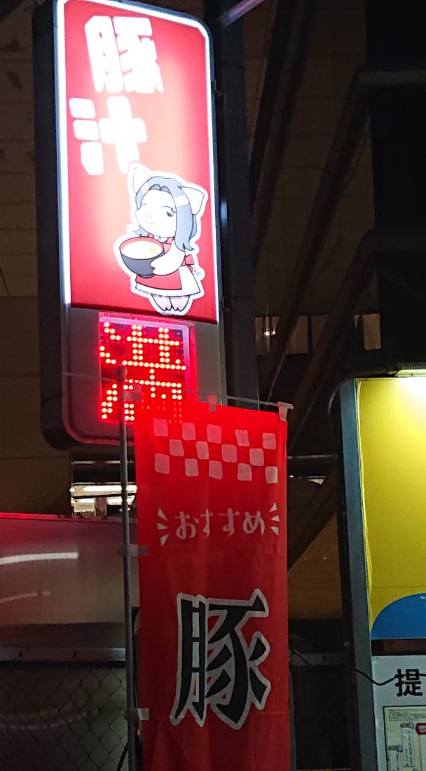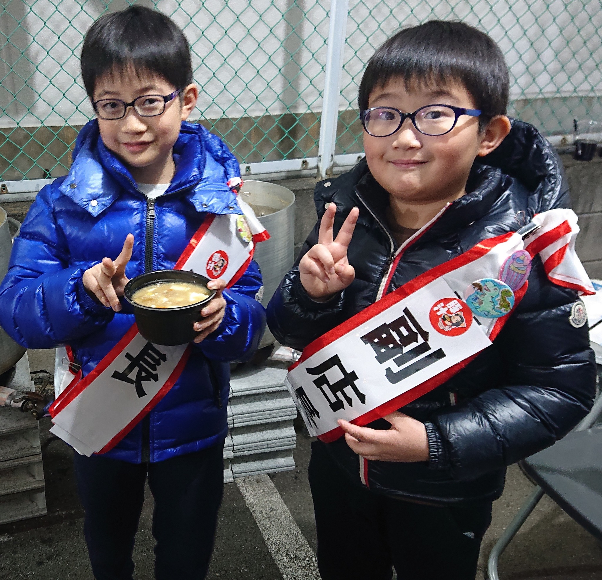 豚汁を『子ども食堂』で よそうのは、【こども店長・副店長📷️】さん(^O^)👍👍。📷駐車場の照明看板が『豚汁』に変わっている所が、スゴい(^O^)👍。