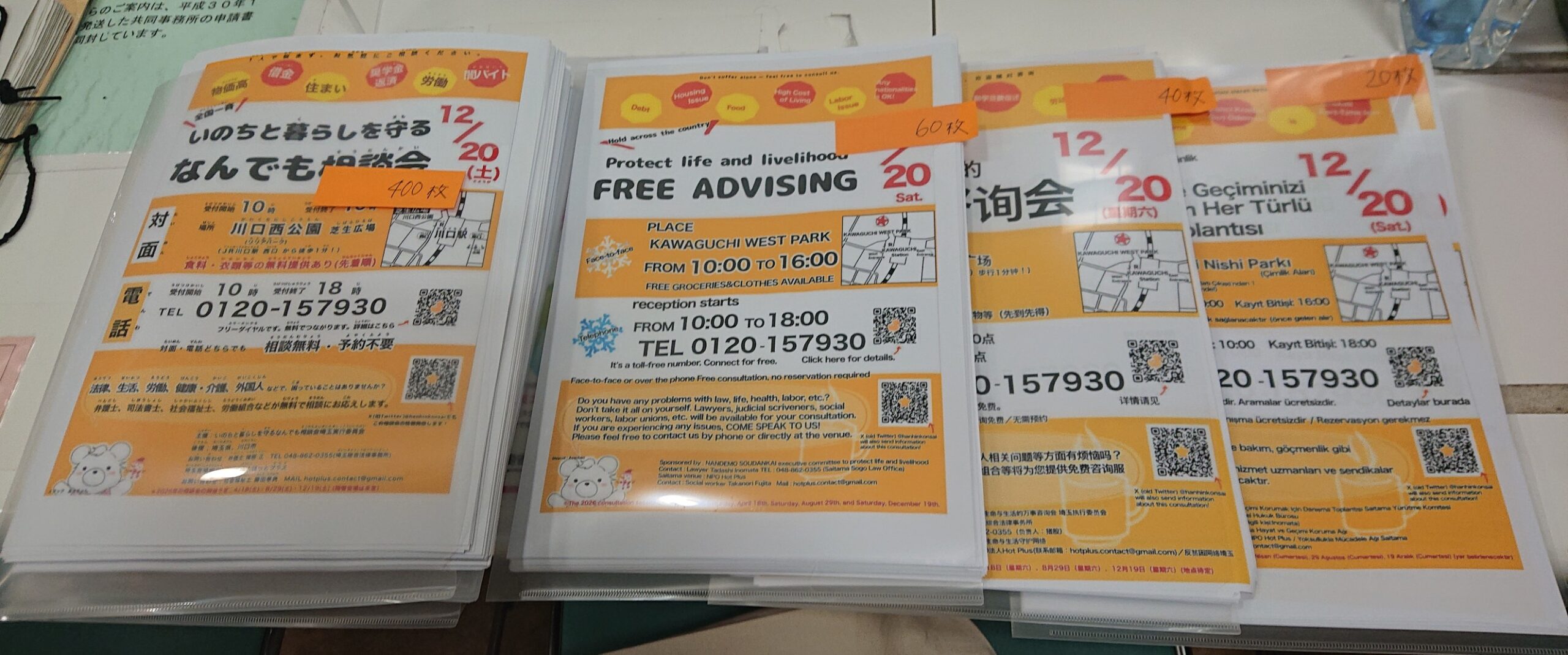 日本語370部・英語60部・中国語40部・トルコ語20部を印刷して持参。
