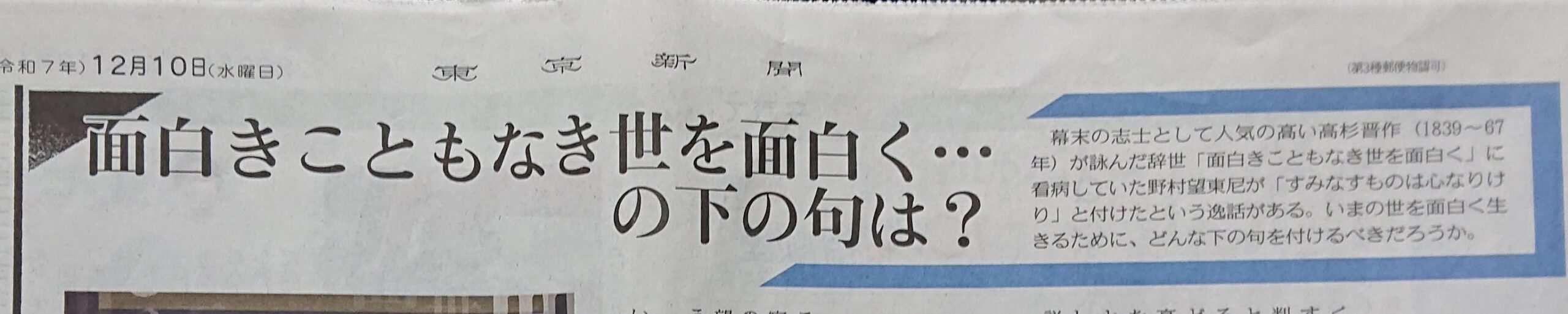 【面白き事も無き世を面白く】 改革 2025年12月13日 Updated: 2025年12月15日 By 中川 ひろし シェア FacebookTwitterPinterestWhatsApp 【面白き事も無き世を面白く】 世の中で1番好きな句だと思う 高杉晋作 病で28才で亡くなった句。私がこの世に居る間、念仏のように何度も唱える事に絶対なる。 📺コーヒーCM☕のフレーズより、こっちが好き💛。29才以上の皆さん、頑張りましょ✌。👧28才以下👨の若い人が、何とかなるように。 私を応援して下さっている皆さま当サイトは『都道府県議会議員アクセスランキング 』に参加しております。 1日1回ご覧になった時に、上の「政治家」バナーをポチッと押して頂けると、他の県の議員などの目に触れて、活動に相乗効果が生まれるので、クリックをお願い致します! 中川 ひろしhttp://www.hiroshinakagawa.jpブログランキング参加中!応援よろしくお願いします → にほんブログ村 ・ 人気ブログランキング シェア FacebookTwitterPinterestWhatsApp Latest news 福祉 📷市内 障がい者団体の🎅クリスマス会🎄 中川 ひろし - 2025年12月15日 改革 運行情報をネットでご確認下さい 中川 ひろし - 2025年12月15日 地域振興 『📷ハリーポッター』が来てくれました 中川 ひろし - 2025年12月15日 改革 埼玉県庁の自殺対策は、大変 にぶいので、具体策を求めています 中川 ひろし - 2025年12月14日 Related news 福祉 📷市内 障がい者団体の🎅クリスマス会🎄 中川 ひろし - 2025年12月15日 改革 運行情報をネットでご確認下さい 中川 ひろし - 2025年12月15日 地域振興 『📷ハリーポッター』が来てくれました 中川 ひろし - 2025年12月15日 改革 埼玉県庁の自殺対策は、大変 にぶいので、具体策を求めています 中川 ひろし - 2025年12月14日