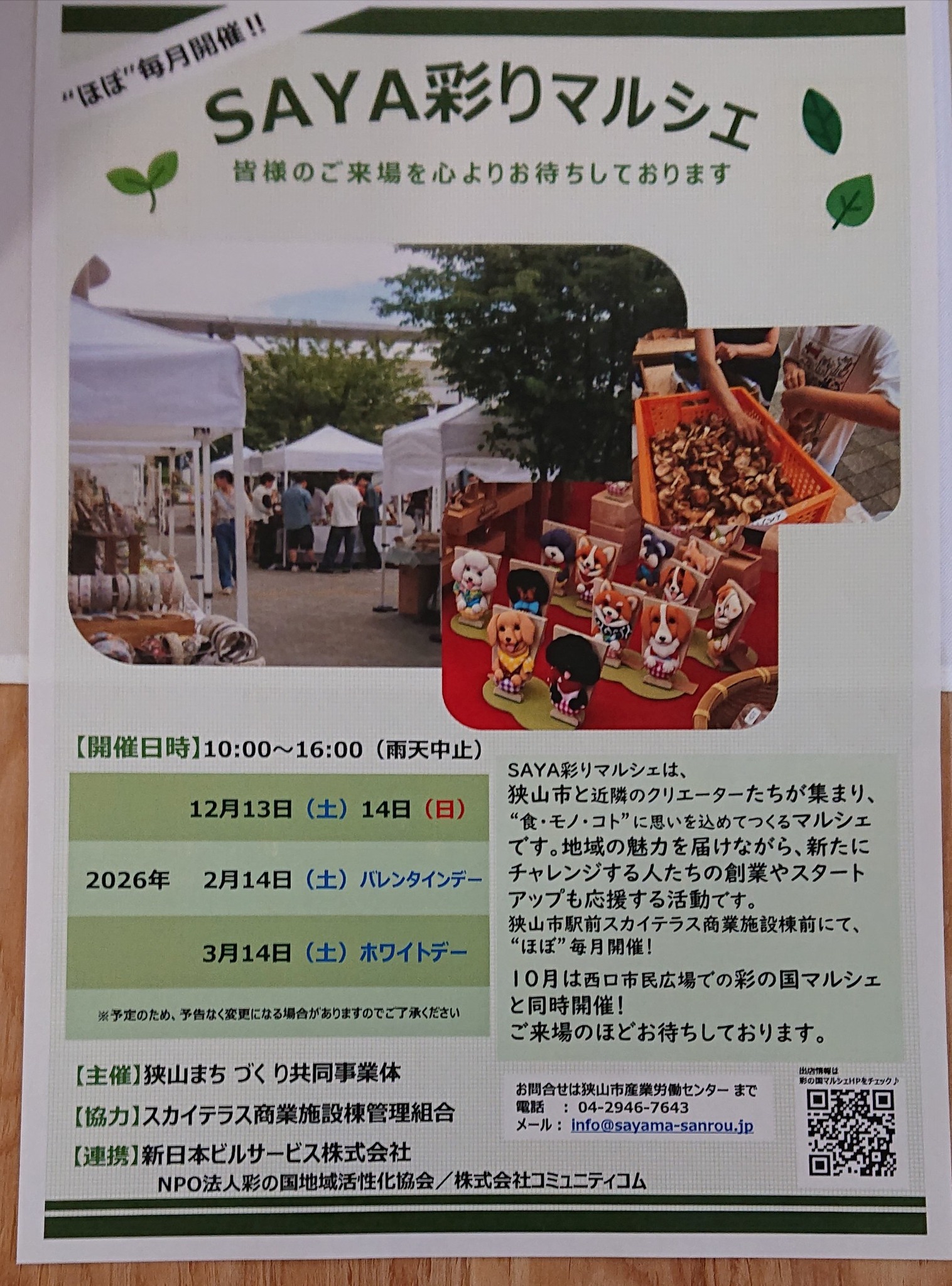 4時までマルシェ狭山市駅西口 地域振興狭山市 2025年12月14日 Updated: 2025年12月15日 By 中川 ひろし シェア FacebookTwitterPinterestWhatsApp 4時までマルシェ。狭山市駅西口。⛄この子達🐤(商品)が、呼んでませんか? 見ると買いたくなっちゃう。ヤバい〰️。(^O^) (後程、追記) 買ってしまいました。 📷️シマエナガちゃん 『一筆書き』のように 🎅クリスマス🎄プレゼント🎁に 漢方で、チャイ 『ネコの会』でお世話に 笑えますよ。なんて読む? (^O^) 次回は、バレンタイン♥️。 民間の方にアドバイスを私からお願いしたら、やはり「『暖色』に」。 頂いたコメントを紹介します 「可愛いです」 私を応援して下さっている皆さま当サイトは『都道府県議会議員アクセスランキング 』に参加しております。 1日1回ご覧になった時に、上の「政治家」バナーをポチッと押して頂けると、他の県の議員などの目に触れて、活動に相乗効果が生まれるので、クリックをお願い致します! 中川 ひろしhttp://www.hiroshinakagawa.jpブログランキング参加中!応援よろしくお願いします → にほんブログ村 ・ 人気ブログランキング シェア FacebookTwitterPinterestWhatsApp Latest news 福祉 📷市内 障がい者団体の🎅クリスマス会🎄 中川 ひろし - 2025年12月15日 改革 運行情報をネットでご確認下さい 中川 ひろし - 2025年12月15日 地域振興 『📷ハリーポッター』が来てくれました!? 中川 ひろし - 2025年12月15日 改革 埼玉県庁の自殺対策は、大変 にぶいので、具体策を求めています 中川 ひろし - 2025年12月14日 Related news 福祉 📷市内 障がい者団体の🎅クリスマス会🎄 中川 ひろし - 2025年12月15日 改革 運行情報をネットでご確認下さい 中川 ひろし - 2025年12月15日 地域振興 『📷ハリーポッター』が来てくれました!? 中川 ひろし - 2025年12月15日 改革 埼玉県庁の自殺対策は、大変 にぶいので、具体策を求めています 中川 ひろし - 2025年12月14日