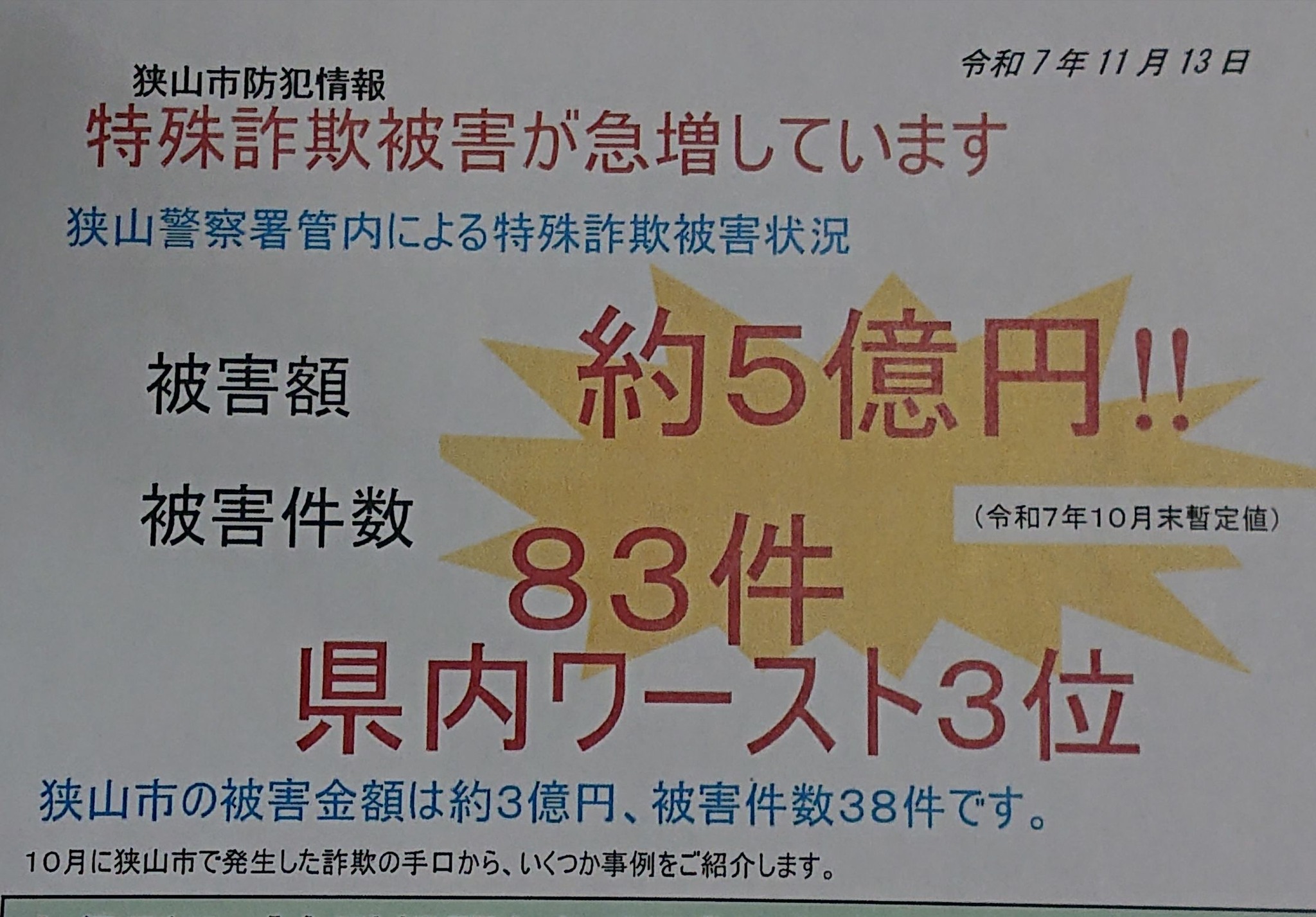 【詐欺】被害 狭山市53件(前年比 +21)、被害額3億5666万(+1億6925万)円 <2025年> 詐欺 2026年1月6日 Updated: 2026年1月7日 By 中川 ひろし シェア FacebookTwitterPinterestWhatsApp 【詐欺】被害 狭山市53件(前年比 +21)、被害額3億5666万(+1億6925万)円 <2025年> 🚨警察 管理職の方から私に連絡が先程あり、速報します。年末年始2度、👮♂️狭山署に伺い、管理職の方と”新たな対策”について意見交換させて頂いております(内容割愛)。狭山市の世帯数からして、この件数は、ものスゴく多い。市役所にも情報提供します。(📷️写真は、11月末時点の、狭山警察署管内の なので、市役所とも連携して新たに作成し、自治会役員さんに頭 下げます)地域の方々のご支援が無いと、また増えてしまいます。m(__)m 私を応援して下さっている皆さま当サイトは『都道府県議会議員アクセスランキング 』に参加しております。 1日1回ご覧になった時に、上の「政治家」バナーをポチッと押して頂けると、他の県の議員などの目に触れて、活動に相乗効果が生まれるので、クリックをお願い致します! 中川 ひろしhttp://www.hiroshinakagawa.jpブログランキング参加中!応援よろしくお願いします → にほんブログ村 ・ 人気ブログランキング シェア FacebookTwitterPinterestWhatsApp Latest news 改革 『🚒埼玉西部消防🚑』の隊員、狭山市消防団役員の方々と具体的に意見交換 中川 ひろし - 2026年1月7日 改革 狭山市などを命懸けで守ってくれている🚒埼玉西部消防🚑 中川 ひろし - 2026年1月7日 改革 せめて🚑救急車の購入費用を数万円でも補助すべき と求めております 中川 ひろし - 2026年1月7日 改革 【🌍️海外出身】の『🚒消防団員』が📷️この街には複数いる❗ 中川 ひろし - 2026年1月7日 Related news 改革 『🚒埼玉西部消防🚑』の隊員、狭山市消防団役員の方々と具体的に意見交換 中川 ひろし - 2026年1月7日 改革 狭山市などを命懸けで守ってくれている🚒埼玉西部消防🚑 中川 ひろし - 2026年1月7日 改革 せめて🚑救急車の購入費用を数万円でも補助すべき と求めております 中川 ひろし - 2026年1月7日 改革 【🌍️海外出身】の『🚒消防団員』が📷️この街には複数いる❗ 中川 ひろし - 2026年1月7日