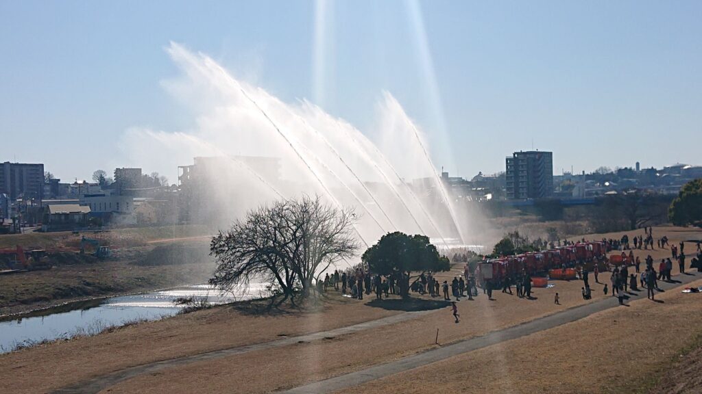 入間川にて。🚒一斉放水。虹が出来る事もありますよ (^_-)-☆。