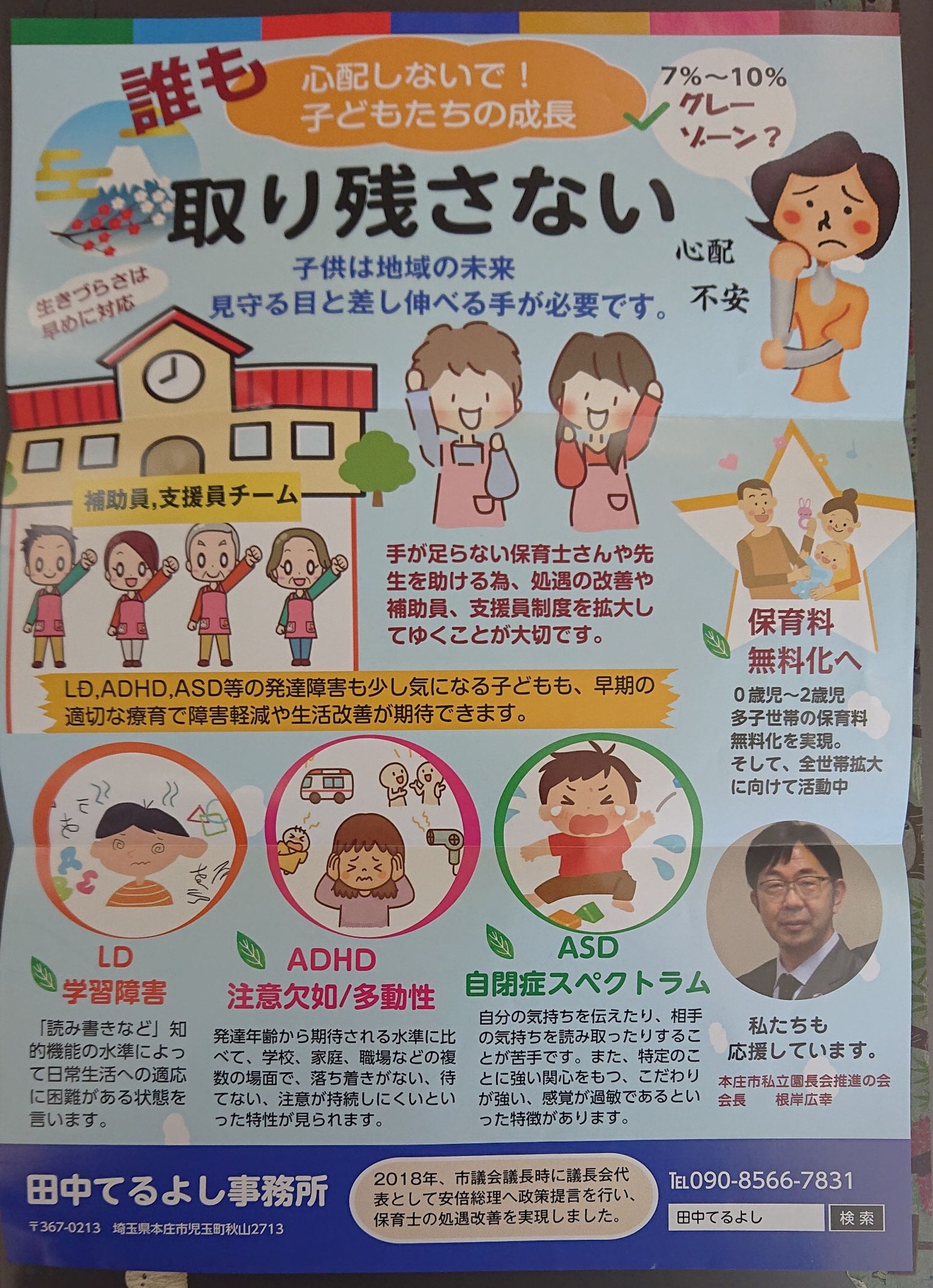 🔶「発達障がい”傾向”の子と、そうではない子の両方に目がとどく保育(先生を増やして対応)を本庄市では5年前から補助金を活用して行なっている」と保育園の園長先生に伺いましたが、県庁は今年度でその補助金制度を廃止してしまう。本庄市は、第2子以上が保育無償(0~2才。国は3子以上)。