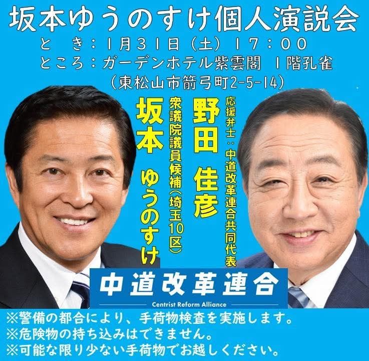 東松山にも今日 (土)5時、野田代表。埼玉、超 重点的ですね❗👍 改革選挙 2026年1月31日 Updated: 2026年1月31日 By 中川ひろし シェア FacebookTwitterPinterestWhatsApp 東松山 にも明日 (土)5時、野田 代表。埼玉、超 重点的ですね❗👍 選挙区が全国で295もあるのに。そして比例単独候補も 28人は いるのに。 #坂本ゆうのすけ 候補の応援に。速報で お伝えします。 #埼玉10区 #中道改革連合 私を応援して下さっている皆さま当サイトは『都道府県議会議員アクセスランキング 』に参加しております。 1日1回ご覧になった時に、上の「政治家」バナーをポチッと押して頂けると、他の県の議員などの目に触れて、活動に相乗効果が生まれるので、クリックをお願い致します! 中川ひろし シェア FacebookTwitterPinterestWhatsApp Latest news 改革 辻本清美さんに質問も させてもらいました。いちき伴子候補を私がネットに紹介にした事について、選挙区の方から好評👍️を頂きました 中川ひろし - 2026年2月1日 改革 米山 隆一 候補が当選しないと困ります 中川 ひろし - 2026年2月1日 改革 すぎむら慎治候補、狭山市での演説(28日(水)) 中川 ひろし - 2026年2月1日 改革 『個人的な意見が言えない』のは、組織が『旧態依然・硬直化』している表れ 中川 ひろし - 2026年2月1日 Related news 改革 辻本清美さんに質問も させてもらいました。いちき伴子候補を私がネットに紹介にした事について、選挙区の方から好評👍️を頂きました 中川ひろし - 2026年2月1日 改革 米山 隆一 候補が当選しないと困ります 中川 ひろし - 2026年2月1日 改革 すぎむら慎治候補、狭山市での演説(28日(水)) 中川 ひろし - 2026年2月1日 改革 『個人的な意見が言えない』のは、組織が『旧態依然・硬直化』している表れ 中川 ひろし - 2026年2月1日