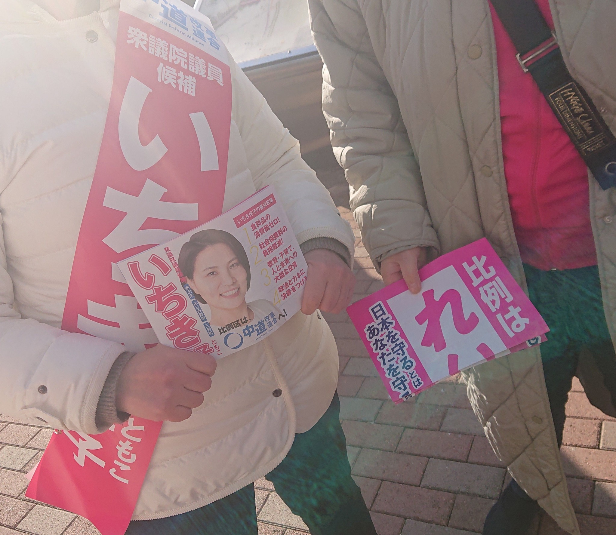写真左📷『#中道』の候補、写真右『れいわ』の選挙スタッフ(ピンク ジャンバー)