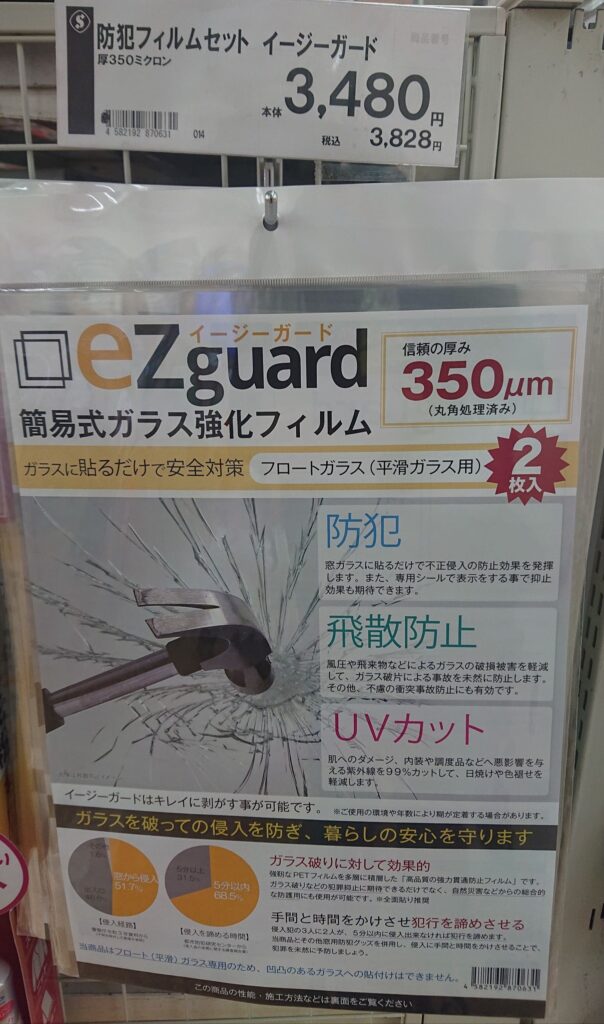 窓ガラスに設置する【防犯ブザー】は「普段、洗濯物などで開け閉めするので『ガラス強化フィルム』なら 設置したい」と 今日言った市民の方もいます。 市内2カ所の ホームセンターのうち、片方は それほど”現在” 在庫が有りません。(こちらのお店ではないほう。つづく)