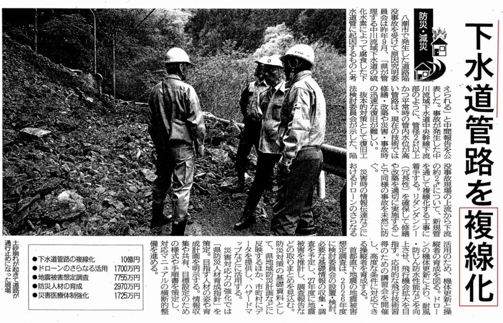 インフラの老朽化は、30年前から分かっていた事ですが、事故を受け初めて、下水管をバイパスのように『複線化』する方針となっています。ただ、県内全ての市町村をそうしてしまおうとすると、家計が持たない県民が先に出て来ます(国民健康保険の増税では既に出て来ています)。今日(月)、観測史上初の『夏日☀』だったように、災害も🌎温暖化などにより、多発するかも知れません。軟弱地盤の地域は多額の費用が掛かるので『人口政策』も考えたほうがいいと思います。行政の安心と、県民の家計が破綻しないようにする 生活の維持のバランスを考える必要がありますね。担当管理職と意見交換しています。(今後またお伝えします。記事は、埼玉新聞 19日)