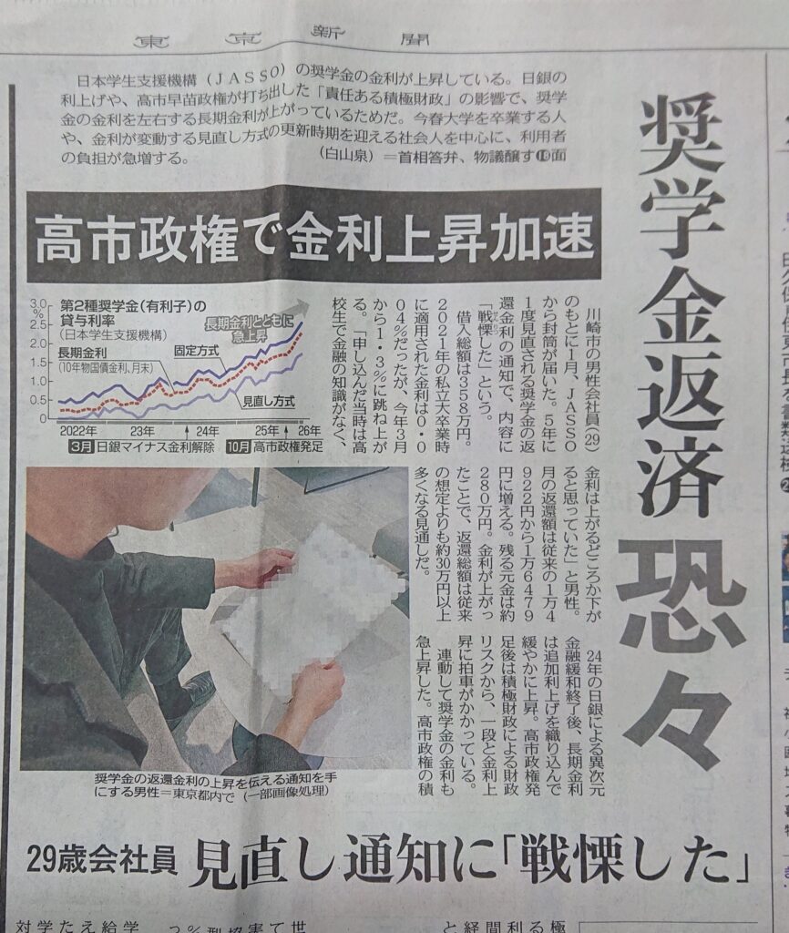 高校の校長先生と、🏫卒業後の進学の給付について今日、意見交換しました 改革 2026年3月2日 Updated: 2026年3月3日 By 中川 ひろし シェア FacebookTwitterPinterestWhatsApp 高校の校長先生と、🏫卒業後の進学の給付について今日、意見交換しました(これまでも)。 借金である奨学金は、4年前の金利0.04%から、今年3月には1.3%まで跳ね上がり、一例で、返済総額は30万円以上増えてしまう。これでは出産どころか、結婚も危ぶまれる若い人を増やしてしまう。 本人の意思と関係無く、政治的な要因での少子化は、かえってその後の本人を(年金・医療・インフラの維持・国内経済の縮小で)苦しませる事になってしまいます。何とかしたい。今後も動いて行きます。 (記事は、東京新聞1面。2月28日) 私を応援して下さっている皆さま当サイトは『都道府県議会議員アクセスランキング 』に参加しております。 1日1回ご覧になった時に、上の「政治家」バナーをポチッと押して頂けると、他の県の議員などの目に触れて、活動に相乗効果が生まれるので、クリックをお願い致します! 中川 ひろしhttp://www.hiroshinakagawa.jpブログランキング参加中!応援よろしくお願いします → にほんブログ村 ・ 人気ブログランキング シェア FacebookTwitterPinterestWhatsApp Latest news 強盗 【犯人逮捕‼️】狭山・強盗事件 中川 ひろし - 2026年3月2日 福祉 東京マラソン🏃ランナーだけで2万8千人 ボランティアさん1万2千人 中川 ひろし - 2026年3月2日 福祉 ”公式・非公式”に関わらず、様々な関わりでボランティアさん達の活躍 中川 ひろし - 2026年3月2日 福祉 コースではない”道路規制”された道のお店など事業者さんも、影の『功労者』ですね 中川 ひろし - 2026年3月2日 Related news 強盗 【犯人逮捕‼️】狭山・強盗事件 中川 ひろし - 2026年3月2日 福祉 東京マラソン🏃ランナーだけで2万8千人 ボランティアさん1万2千人 中川 ひろし - 2026年3月2日 福祉 ”公式・非公式”に関わらず、様々な関わりでボランティアさん達の活躍 中川 ひろし - 2026年3月2日 福祉 コースではない”道路規制”された道のお店など事業者さんも、影の『功労者』ですね 中川 ひろし - 2026年3月2日