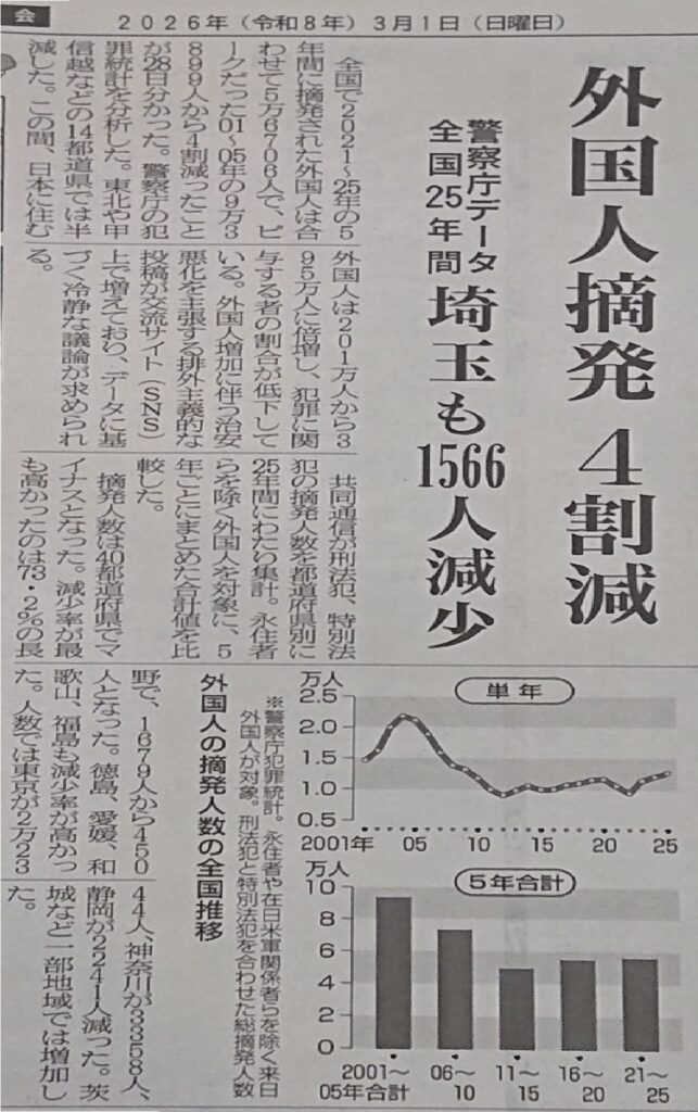 🔶日本人をはじめ犯罪件数は、1950年代の年60万人がピークで、近年は20万人前後(📷️埼玉新聞 3月1日)。大事なのは、不安感を具体的な安心に どう少しずつ つなげて行けるか。