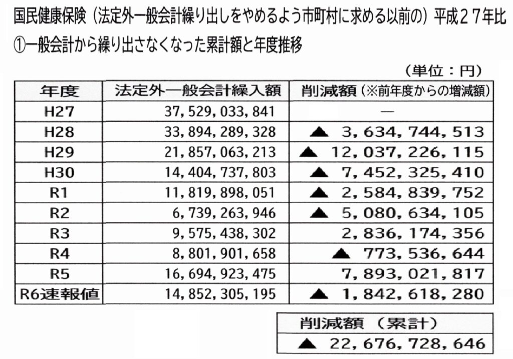 税金投入しなくなった影響 改革国民健康保険 2026年3月5日 Updated: 2026年3月6日 By 中川 ひろし シェア FacebookTwitterPinterestWhatsApp 『国民健康保険税(国保税)』を払えない県民が出てしまっているのは、低所得者対策として国保への【税金投入】を市町村が独自に行なっていたのに、県庁がやめるよう指導していて、税金投入出来ない分を増税しているせいでもあります。実際に払えない狭山市民から相談を頂いており、このままでは経営しているお店が担保に取られ、無くなってしまいかねない方も。そこで、県内の市町村議員とも グループで連携して取り組んでいます。 税金投入しなくなった影響額は累計で、226億円にもなります(一昨年度まで)。 (📷『一般会計繰り入れ』と書かれているのが『税金投入』の事です。) 私を応援して下さっている皆さま当サイトは『都道府県議会議員アクセスランキング 』に参加しております。 1日1回ご覧になった時に、上の「政治家」バナーをポチッと押して頂けると、他の県の議員などの目に触れて、活動に相乗効果が生まれるので、クリックをお願い致します! 中川 ひろしhttp://www.hiroshinakagawa.jpブログランキング参加中!応援よろしくお願いします → にほんブログ村 ・ 人気ブログランキング シェア FacebookTwitterPinterestWhatsApp Latest news 国民健康保険 『国民健康保険(国保)』の低所得者を守る為 中川 ひろし - 2026年3月5日 国民健康保険 来年度(令和8年度)までにやめさせたい県庁の方針 中川 ひろし - 2026年3月5日 国民健康保険 国民健康保険 加入者が、わずか7年間で『22%減』 中川 ひろし - 2026年3月5日 国民健康保険 国民健康保険の加入者は、『個人事業』主、非正規、退職後など 中川 ひろし - 2026年3月5日 Related news 国民健康保険 『国民健康保険(国保)』の低所得者を守る為 中川 ひろし - 2026年3月5日 国民健康保険 来年度(令和8年度)までにやめさせたい県庁の方針 中川 ひろし - 2026年3月5日 国民健康保険 国民健康保険 加入者が、わずか7年間で『22%減』 中川 ひろし - 2026年3月5日 国民健康保険 国民健康保険の加入者は、『個人事業』主、非正規、退職後など 中川 ひろし - 2026年3月5日