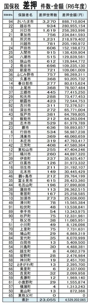 国民健康保険税を払えず、『家・お店・お金』などを、差し押さえられた数。
