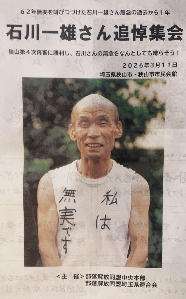 3月11日は、石川一雄さんの命日なのに、県議会があって、”狭山の県議”として 残念ながら参列(4時から。480人)出来ず、打合せ後、🏃走って🚋電車移動し、狭山に戻った時には4人だけ残ってくれた懇談会に40分間だけ参加しました(疲労困憊過ぎて体調良くは無く、退席)。
