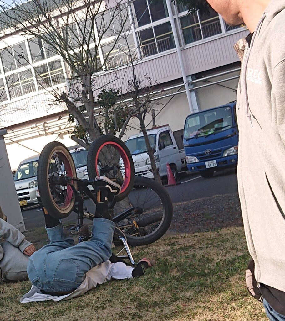 空中での、🚴自転車の取り回し(手足の さばき)は、こうやってでないとトレーニングしづらいそうです。