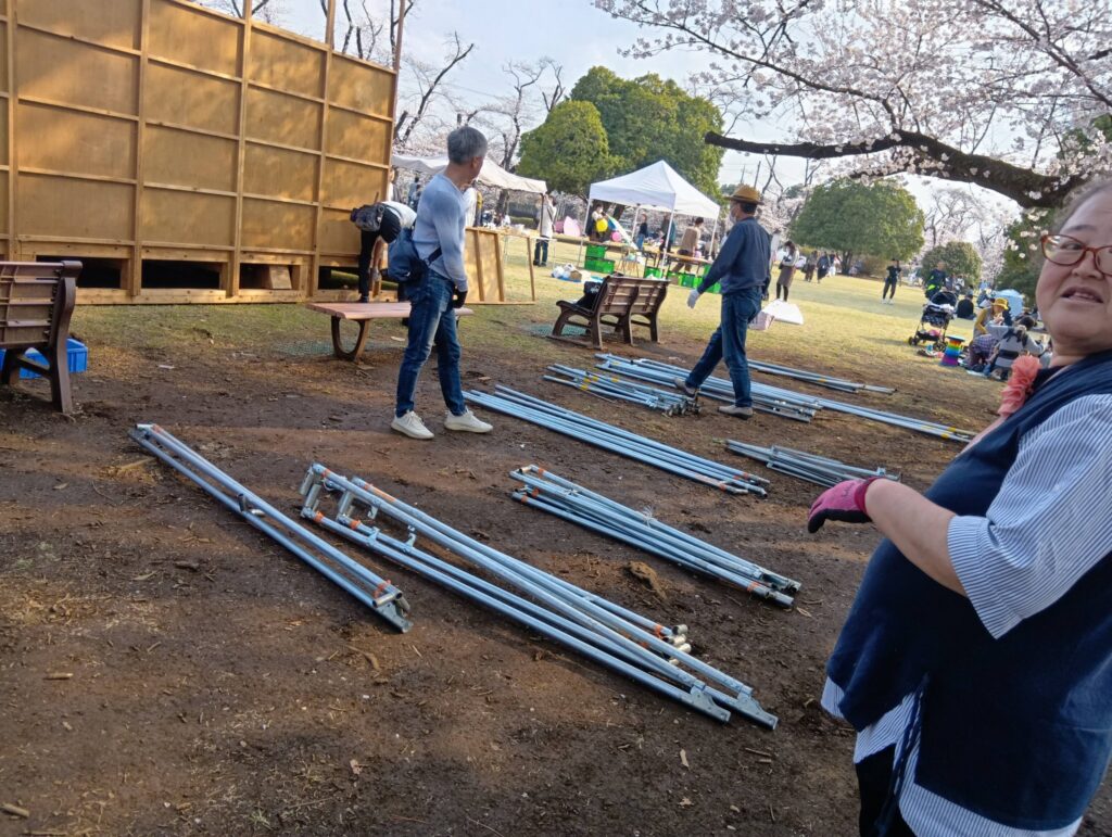 🌸稲荷山公園での『桜祭り』片付け。20kg以上の組んだ木材をトラックの荷台に何度も持ち上げる。①女性や、②親とあまり変わらない年令の30年近くお世話になっているボランティアの男性の方々が 手伝おうとされたので、☺笑顔でお断りし、1時間💦。