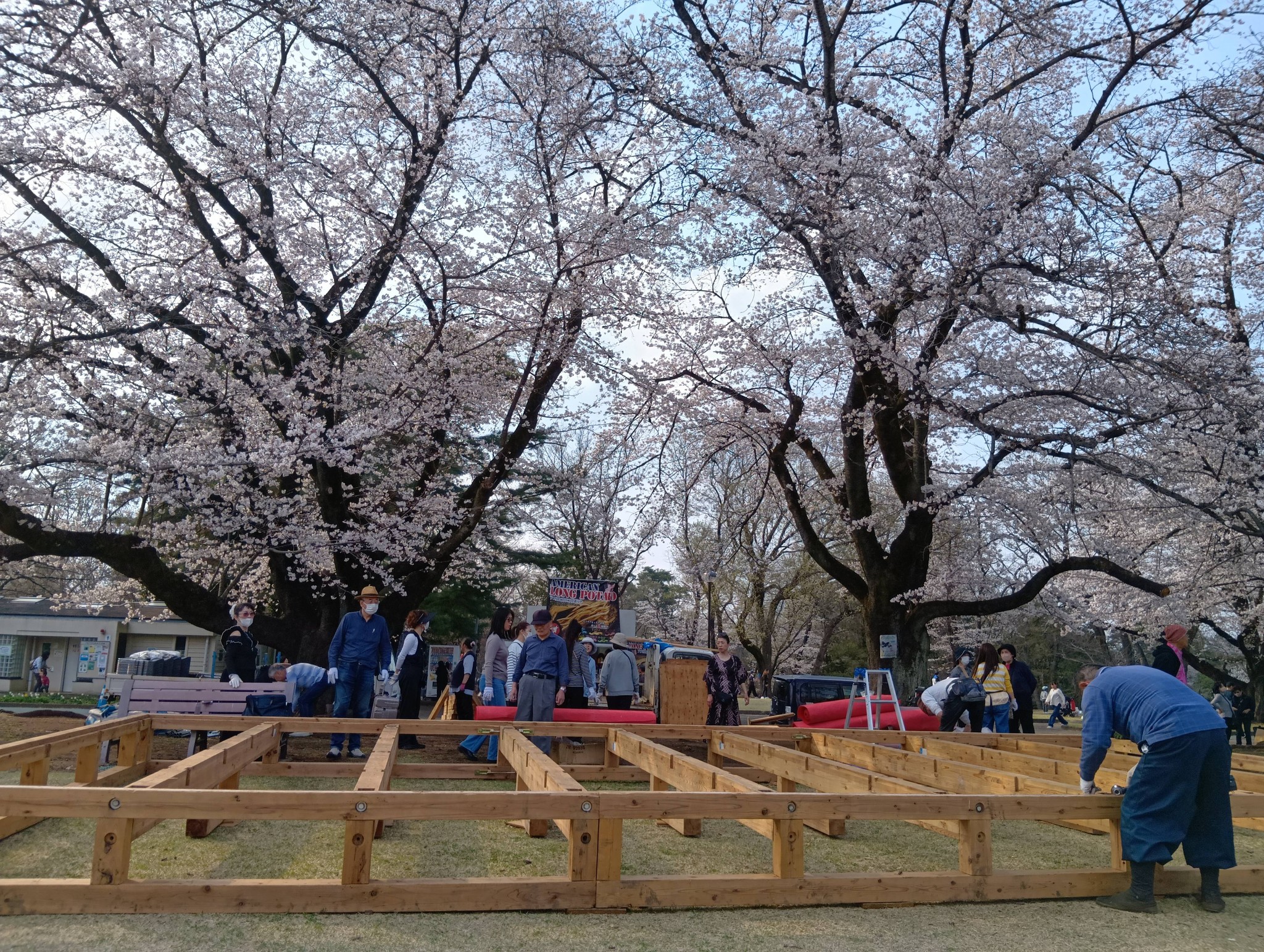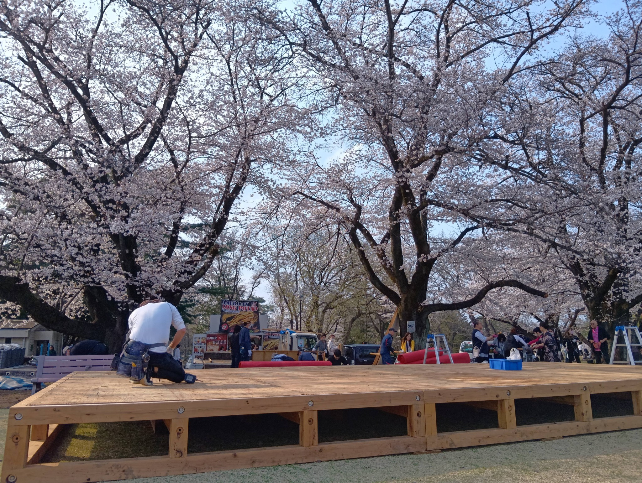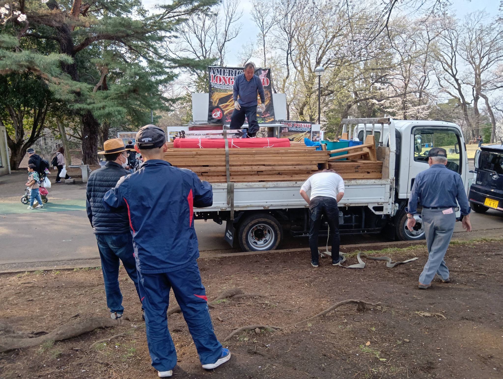 🌸稲荷山公園での『桜祭り』片付け。20kg以上の組んだ木材をトラックの荷台に何度も持ち上げる。①女性や、②親とあまり変わらない年令の30年近くお世話になっているボランティアの男性の方々が 手伝おうとされたので、☺笑顔でお断りし、1時間💦。