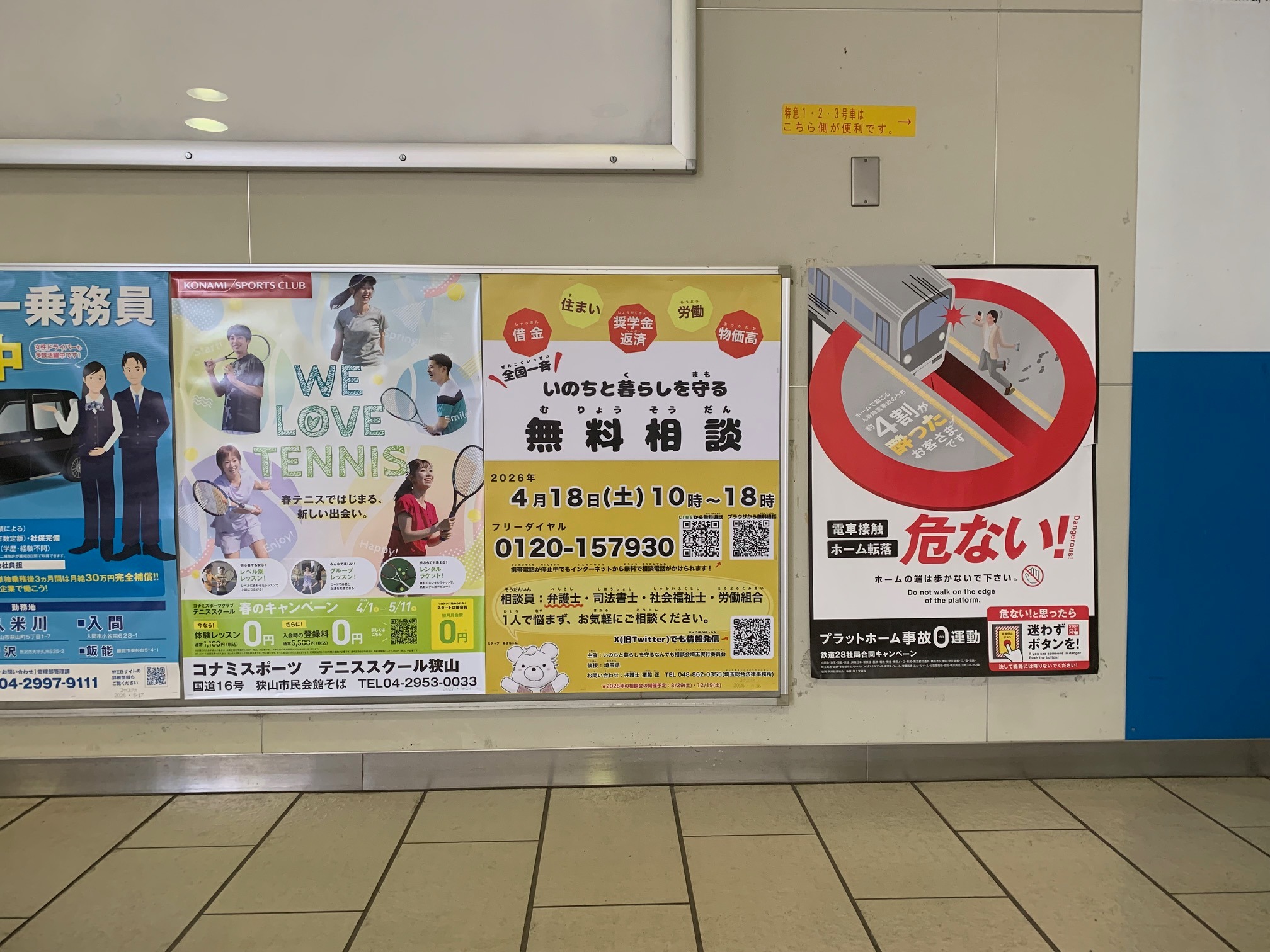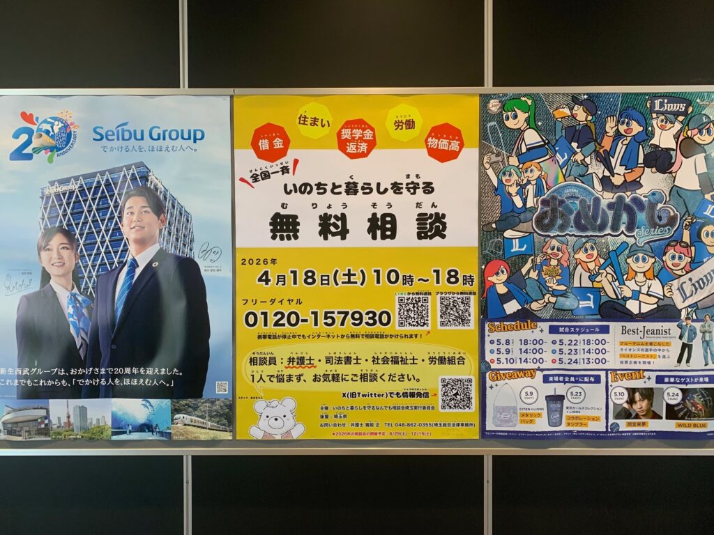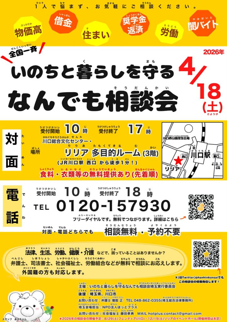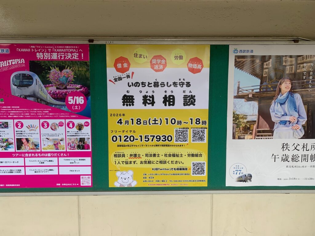 弁護士などによる無料電話相談 福祉 2026年4月17日 Updated: 2026年4月20日 By 中川 ひろし シェア FacebookTwitterPinterestWhatsApp 【弁護士などによる無料電話相談】 あす(土)10~6時 狭山市内 各駅には独自に、相談会の度に1週間 掲示しております。こんな時代ですから、1人で悩まず、心に抱えている事をお話になりませんか? ☎電話相談 0120-157930 全国一斉 いのちと暮らしを守るなんでも相談会 (18(土) ひろし事務所は、お休みします) リアル会場もあり、今回は川口駅前です 狭山市駅 狭山市内では独自に☎電話相談versionを、掲示しています。 新狭山駅 入曾駅 稲荷山公園駅 私を応援して下さっている皆さま当サイトは『都道府県議会議員アクセスランキング 』に参加しております。 1日1回ご覧になった時に、上の「政治家」バナーをポチッと押して頂けると、他の県の議員などの目に触れて、活動に相乗効果が生まれるので、クリックをお願い致します! 中川 ひろしhttp://www.hiroshinakagawa.jpブログランキング参加中!応援よろしくお願いします → にほんブログ村 ・ 人気ブログランキング シェア FacebookTwitterPinterestWhatsApp Latest news 改革 『困っている現場で仕事』しないと、困っている人の視点に立つ事は、困難です 中川 ひろし - 2026年4月6日 改革 石油枯渇 対策 見やすいように🎥『テロップ付き版』にして 中川 ひろし - 2026年4月5日 改革 ⚡️エネルギー政策・温暖化対策は急務です 中川 ひろし - 2026年4月5日 改革 『再審法 議員立法での改正』を求め埼玉・加須市で講演会 中川 ひろし - 2026年4月4日 Related news 改革 『困っている現場で仕事』しないと、困っている人の視点に立つ事は、困難です 中川 ひろし - 2026年4月6日 改革 石油枯渇 対策 見やすいように🎥『テロップ付き版』にして 中川 ひろし - 2026年4月5日 改革 ⚡️エネルギー政策・温暖化対策は急務です 中川 ひろし - 2026年4月5日 改革 『再審法 議員立法での改正』を求め埼玉・加須市で講演会 中川 ひろし - 2026年4月4日