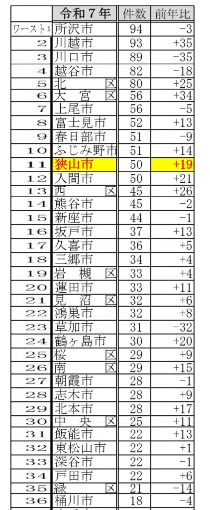 狭山市は被害件数で11番目に多いのに、通報では23番目と、依然低い状況なのは、被害が減りにくい雰囲気にあります(未遂・被害を含めた🚨警察署に電話など頂いている『予兆』通報。昨年)。こうなると、被害件数も、実態はもっと多いと思っておいたほうが、対策を冷静に考えられます。