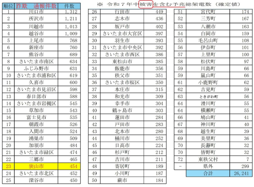 【詐欺】通報件数が、被害数の割に少ない狭山市
