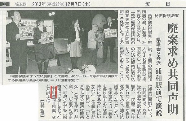 特定秘密保護法廃案求め、埼玉で3会派共同演説